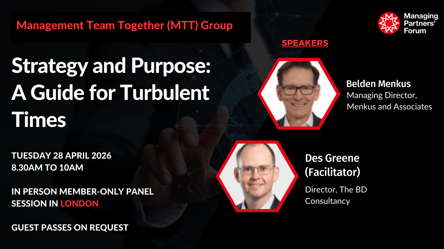 In our April session, leading consultant Belden Menkus shares with us how rapid and uncertain change is reshaping the way firm leaders think about and deliver strategy and purpose. Drawing on insights from more than 150 conversations with senior leaders through his The Purposeful Strategist podcast, alongside original research into AI adoption across the legal sector, the session will examine why clarity of purpose, adaptability, and clear strategic choices are now central to firm success.